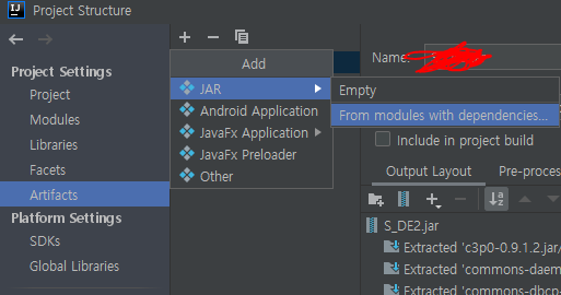 3. Project Settings - Artifacts - + JAR - From modules with dependencies... 클릭