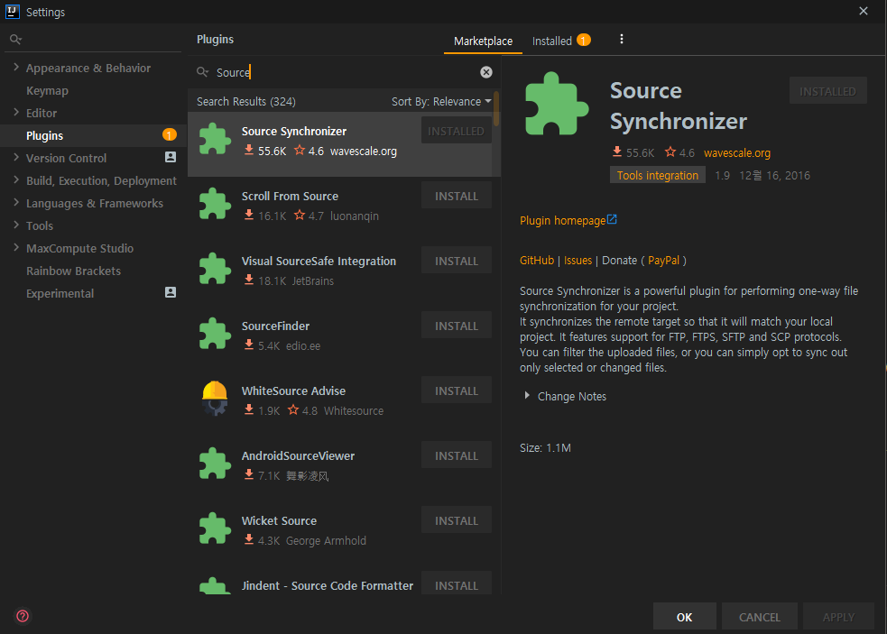 MarketPlace 선택, Source 검색하여 Source Synchronizer 플러그인 설치