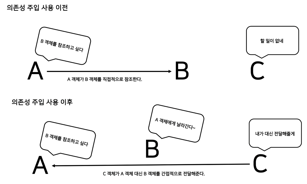 A라는 특정 객체가 B라는 다른 객체를 참조하고 싶다면 이전 같은 경우에는 A가 B를 직접적으로 참조하였습니다. 그러나 의존성 주입을 활용한다면 C라는 하나의 객체가 A라는 특정 객체를 대신해 의존성을 간접적으로 전달해주고 있는 모습을 볼 수 있습니다.